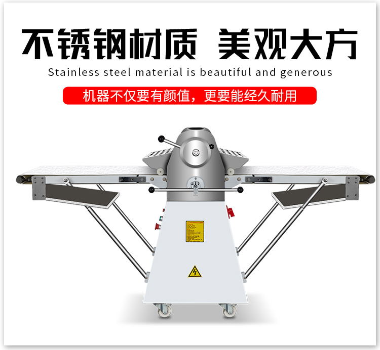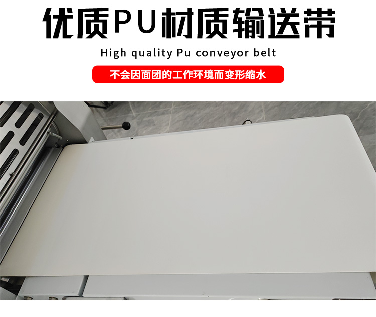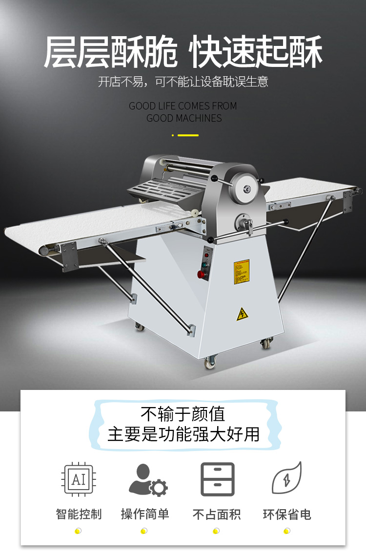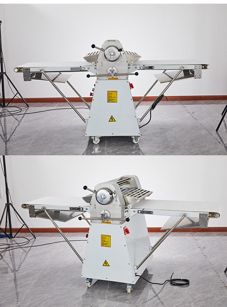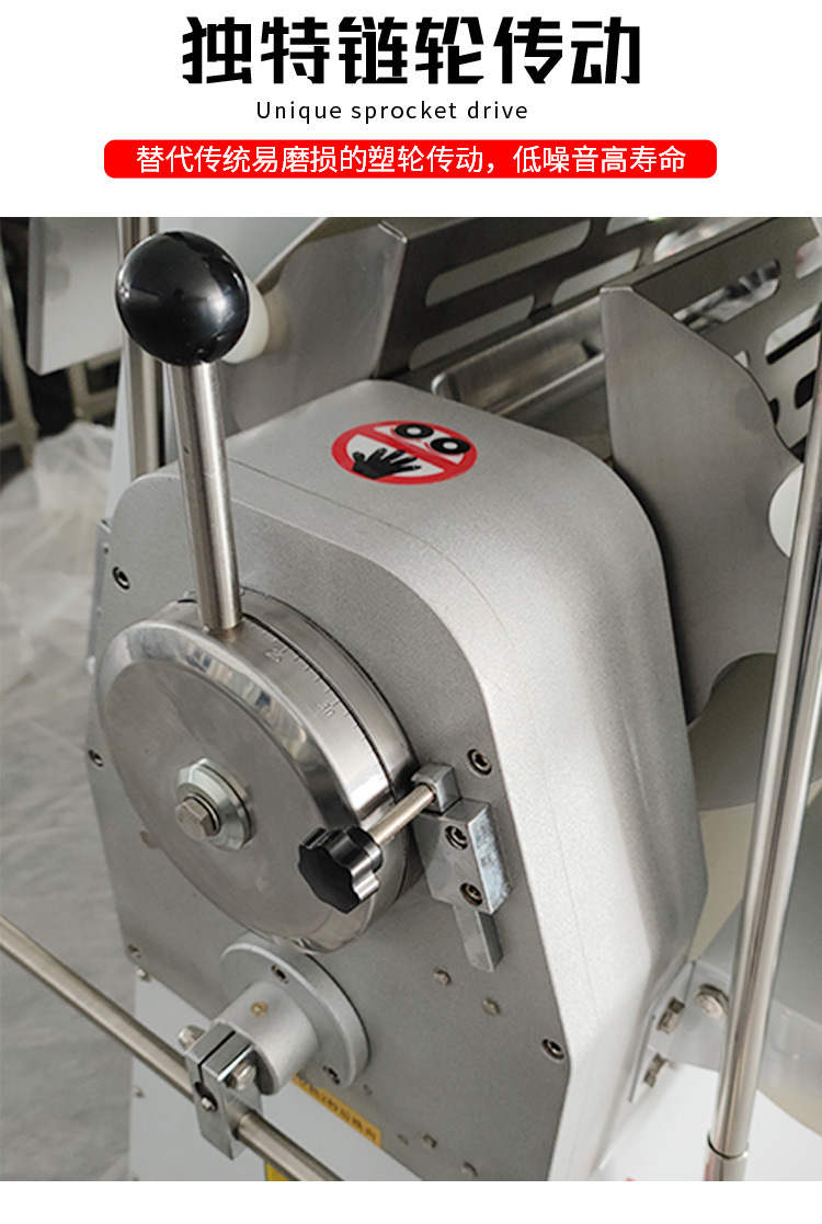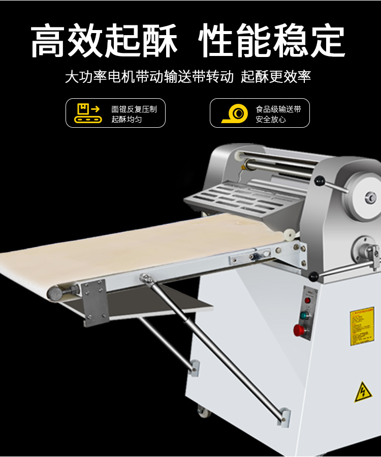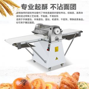 LSP-520酥皮機,采用獨特的鏈輪傳動替代了傳統易磨損的塑輪傳動,低噪音,高壽命滾輪經過特殊工藝處理,不粘麵,不易刮傷適用於手撕麵包、羊角麵包、蛋撻、老婆餅、千層餅,等酥皮類食品,也可用於輾壓麵團。
